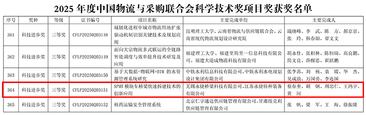 近日,由江苏永捷特种装备有限公司与无锡永捷桥梁科技有限公司共同申报的“SPMT模块车桥梁快速拆建技术的创新应用”项目,凭借其卓越的技术创新性和显著的行业贡献,从全国上千个参赛项目中脱颖而出,一举斩获2025年度中国物流与采购联合会科学技术进步三等奖!